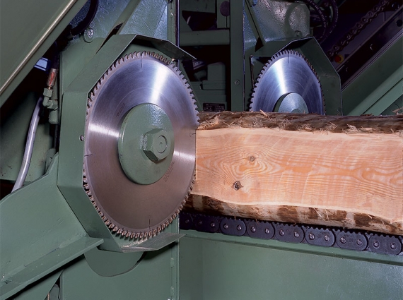 As standard, the system incorporates a twin, double arbour circular saw behind the canter. This is integrated with an automatic roundabout system to recycle the timber to produce the finished product. As an option particularly where kerf is required to be at a minimum, the canter system can be supplied with twin or even quad bandsaws in place of the circular saw. In addition, the roundabout can be replaced by a second canter system producing the finished product in one single pass.